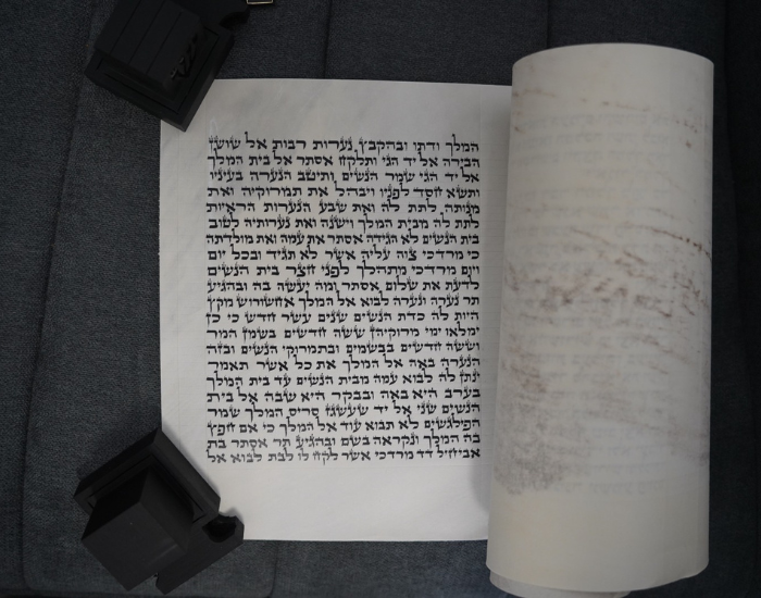 מגילת אסתר למכירה (ללא בית מגילה), 21 שורות ו20 עמודות. כתב עבה נאה ומהודר במיוחד. הזמנות מרוכזות לפני פורים היישר עד בית הלקוח. עצה שלי להזמין במהלך השנה ולא לפני פורים.